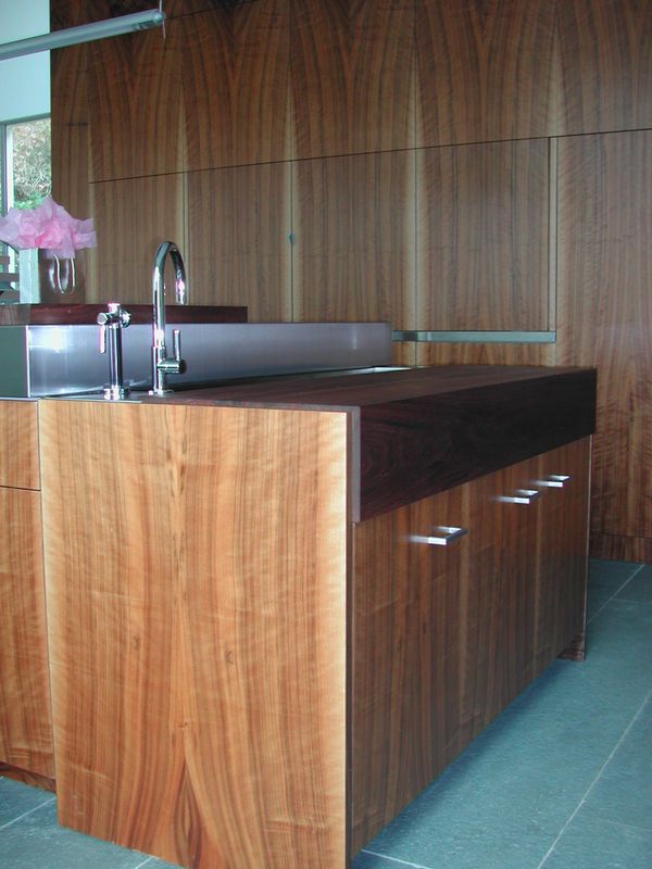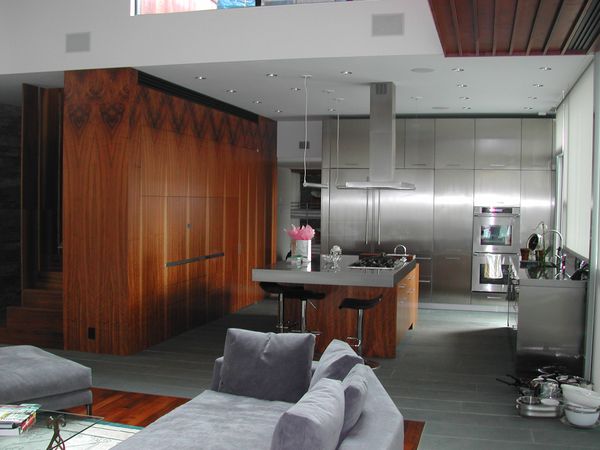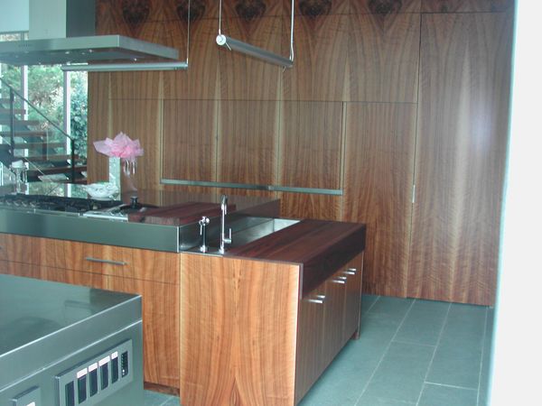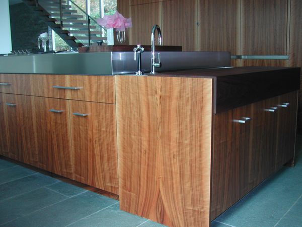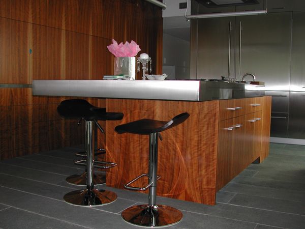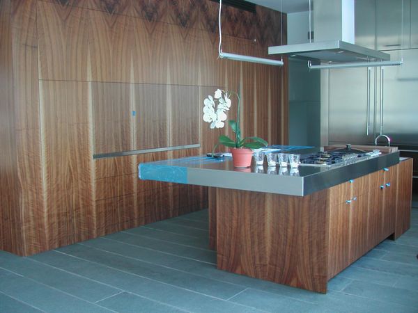 New York City Client wanted this waterfront home to incorporate stainless and walnut throughout the lower level mixed with various other veneers throughout the home. The architect's vision was to show veneer from root to branch in these twelve foot high flitches incorporated into this very functional kitchen. Stairway to second floor was also included in this theme.