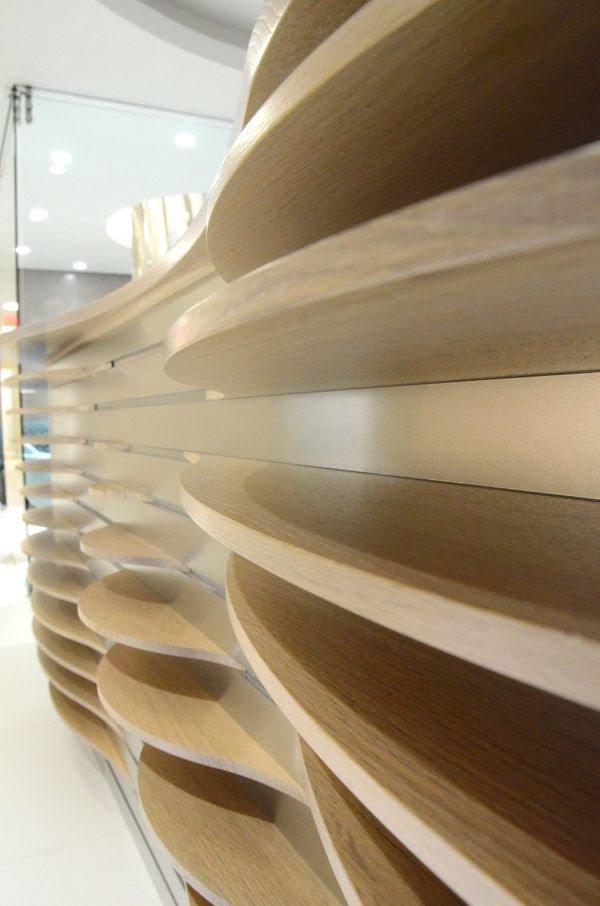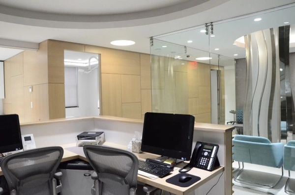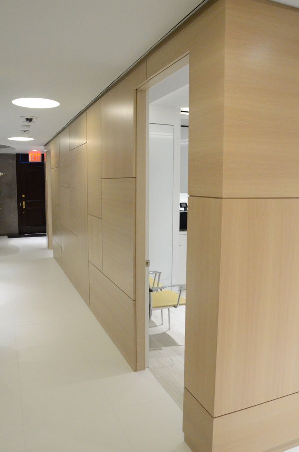Park Avenue clients wanted to make a statement when their clients visited with a combination of metal and wood within the millwork. The award-winning reception desk and Mondrian wall design were finished with a white wash stain.