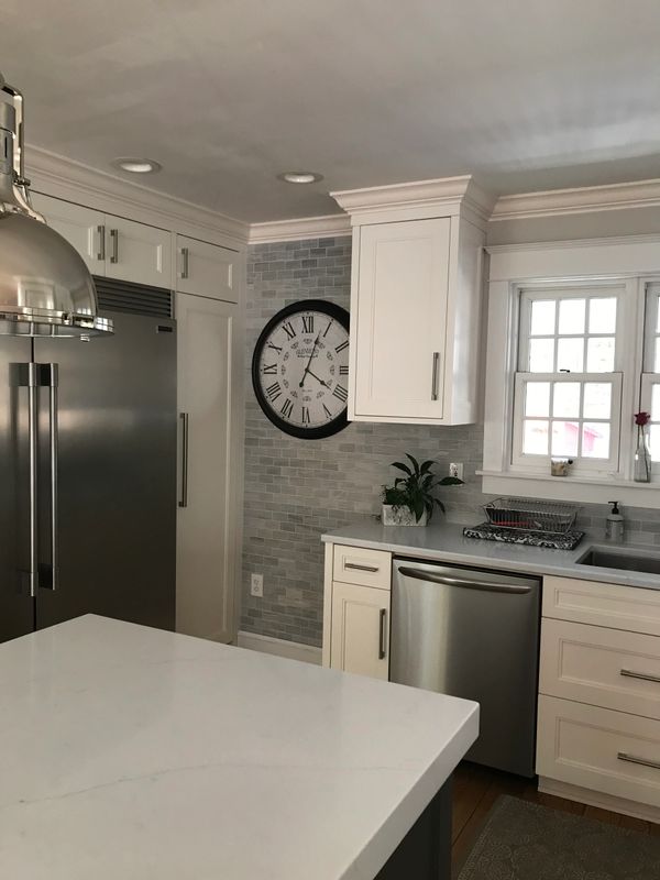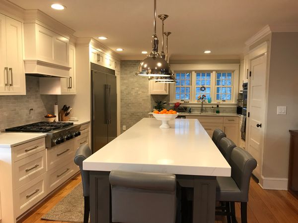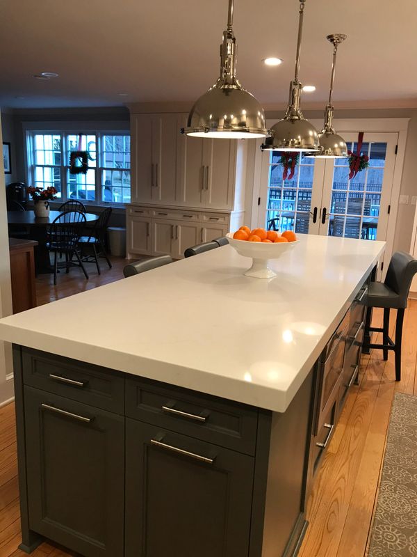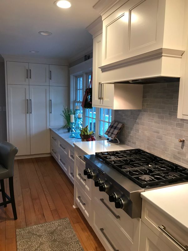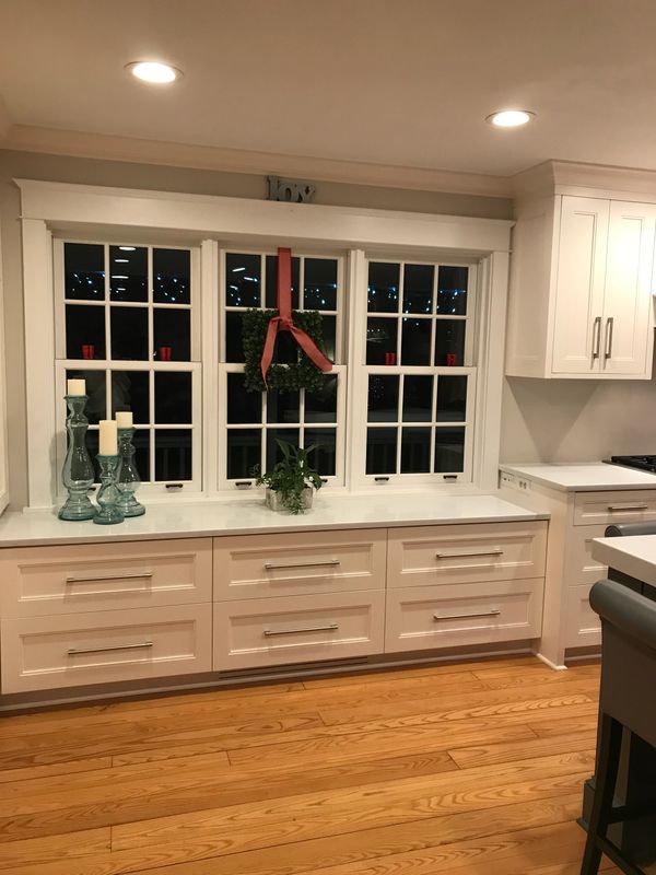Completed residential kitchen showing trend toward utilizing drawer banks in lieu of base cabinet doors for easy access throughout. Incorporated 1- 1/2" end panels to simulate inset cabinet doors and drawer fronts. Soft-close undermount drawer slides and solid wood dovetail drawer boxes were used.